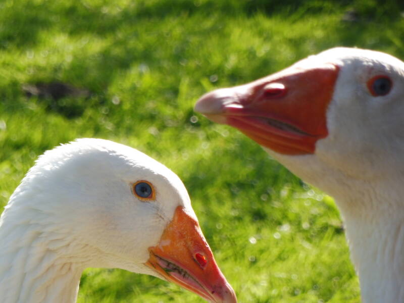 „Die großen Gänse sind schon richtige Charaktertiere. Mit stolzem Gang ziehen sie über die Wiese, immer aufmerksam, immer wachsam. Sie kennen ihren Platz im Garten genau und halten zusammen wie eine kleine Familie. Wenn jemand zu nahe kommt, machen sie sich laut bemerkbar – denn ihre Aufgabe als Hüter des Hofes nehmen sie sehr ernst. Doch wer sie kennt, weiß: Hinter dem lauten Geschnatter stecken kluge, neugierige und oft sehr sanfte Tiere. Besonders gerne baden sie im Wasser, zupfen frisches Gras und genießen die Sonnenstrahlen auf ihrem Gefieder.“